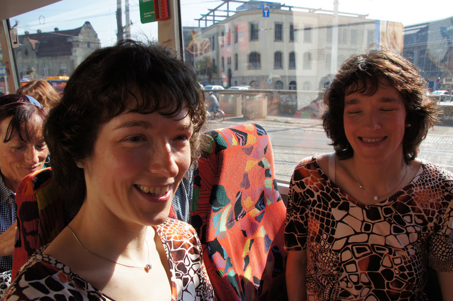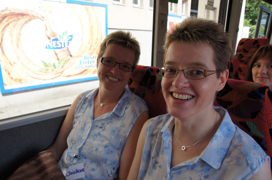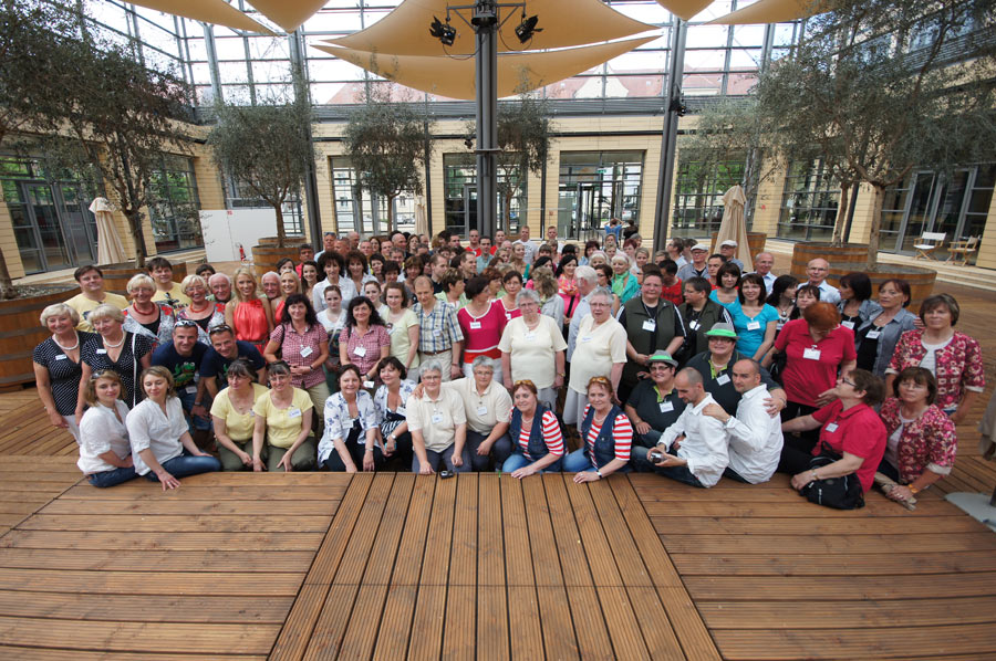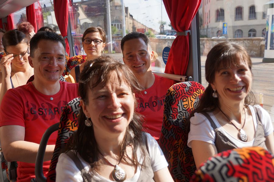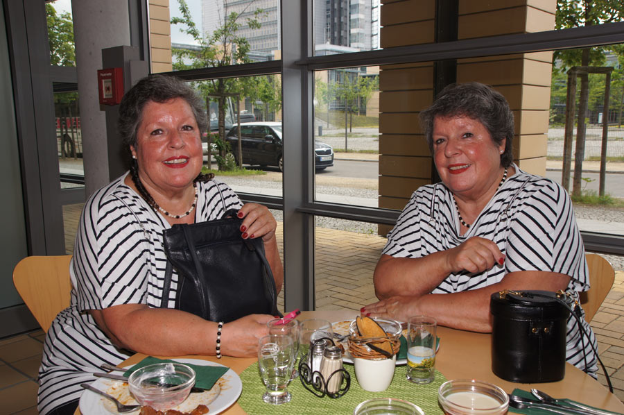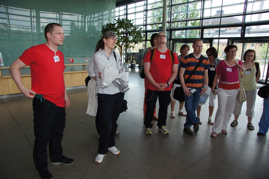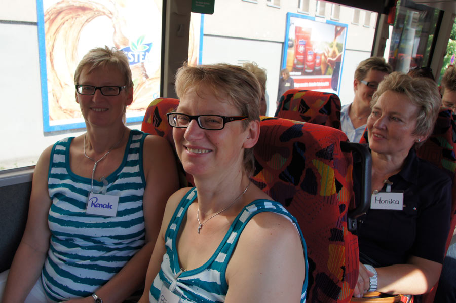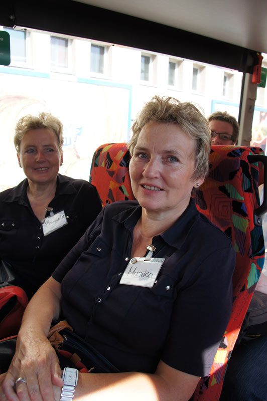 Am nächsten Vormittag standen vor dem Hotel bereits drei (!) Reisebusse bereit, um die Zwillinge nach dem Frühstück zu einer Freitreppe am Völkerschlachtdenkmal zu bringen, einem attraktiven Ort für das Gruppenfoto. Danach ging es direkt weiter zum Gelände des MDR. Die Gruppen teilten sich jetzt auf. Die Insassen von Bus 1 u. 2 brachen zur MDR Studiotour auf und wurden bereits von netten Gästeführerinnen erwartet. Die Zwillinge in Bus 3 konnten dagegen eine freundliche Stadtführerin begrüßen, die während der folgenden Stadtrundfahrt viel über die Stadt und ihre Bewohner zu berichten wusste. Zum Mittagessen in der großen Cafeteria waren alle Zwillinge wieder vereint. Später trennten sich die Gruppen dann wieder und beschritten die Wege der jeweils anderen vom Vormittag.