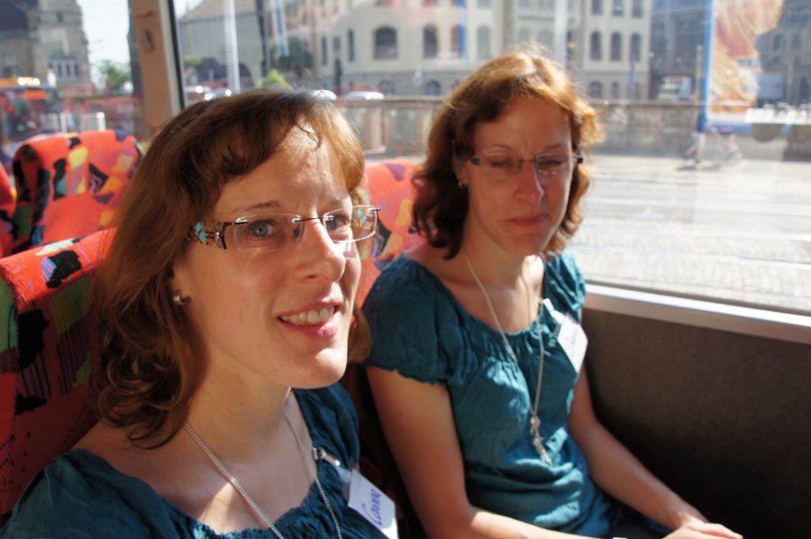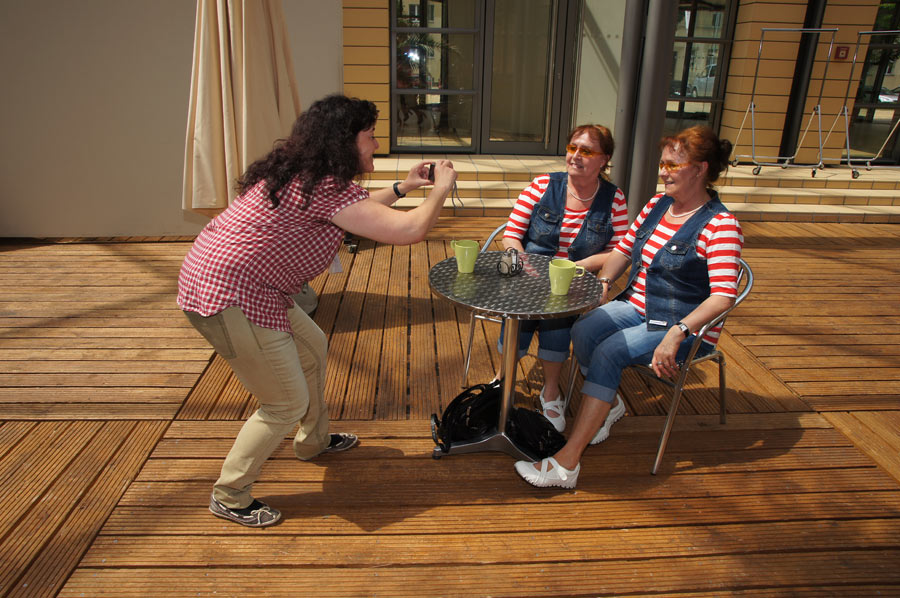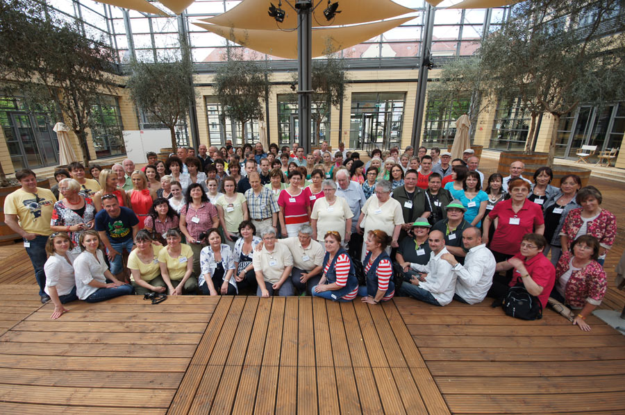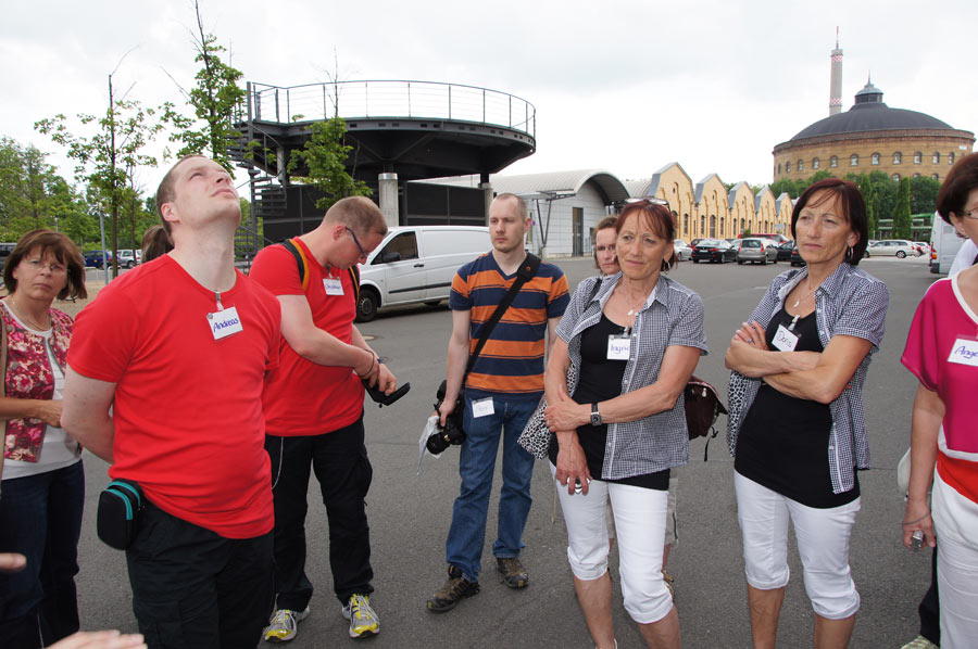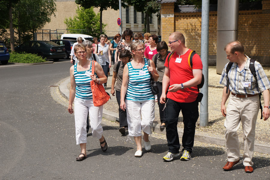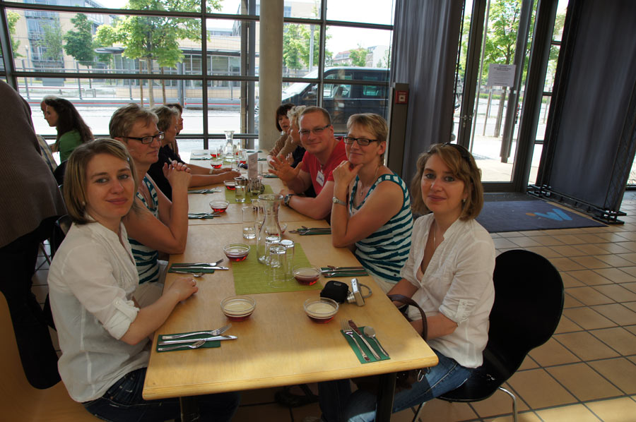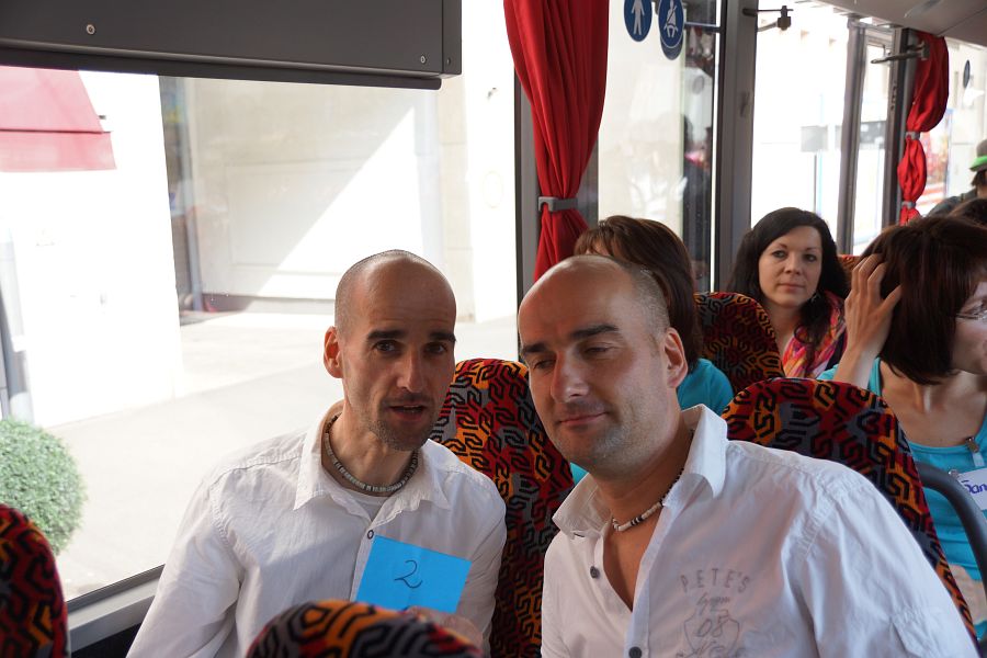 Am nächsten Vormittag standen vor dem Hotel bereits drei (!) Reisebusse bereit, um die Zwillinge nach dem Frühstück zu einer Freitreppe am Völkerschlachtdenkmal zu bringen, einem attraktiven Ort für das Gruppenfoto. Danach ging es direkt weiter zum Gelände des MDR. Die Gruppen teilten sich jetzt auf. Die Insassen von Bus 1 u. 2 brachen zur MDR Studiotour auf und wurden bereits von netten Gästeführerinnen erwartet. Die Zwillinge in Bus 3 konnten dagegen eine freundliche Stadtführerin begrüßen, die während der folgenden Stadtrundfahrt viel über die Stadt und ihre Bewohner zu berichten wusste. Zum Mittagessen in der großen Cafeteria waren alle Zwillinge wieder vereint. Später trennten sich die Gruppen dann wieder und beschritten die Wege der jeweils anderen vom Vormittag.