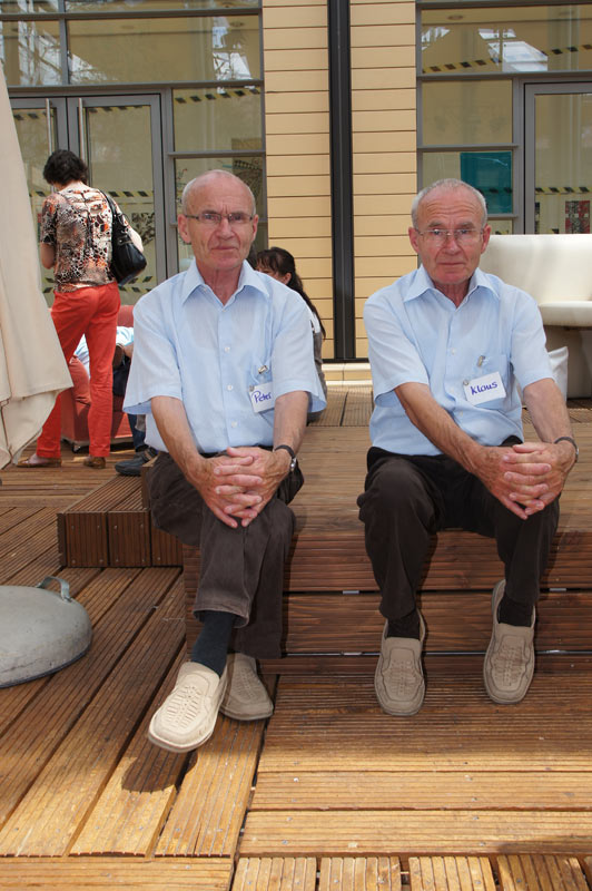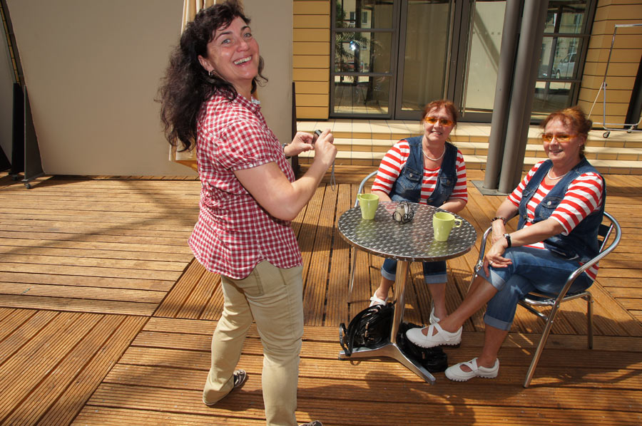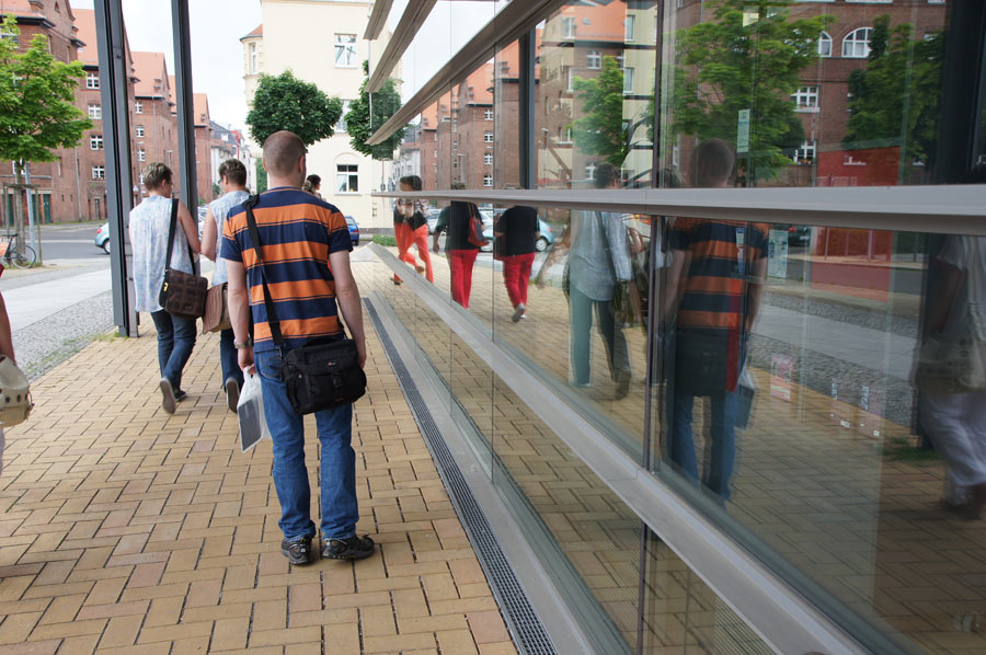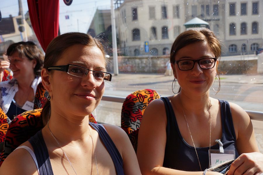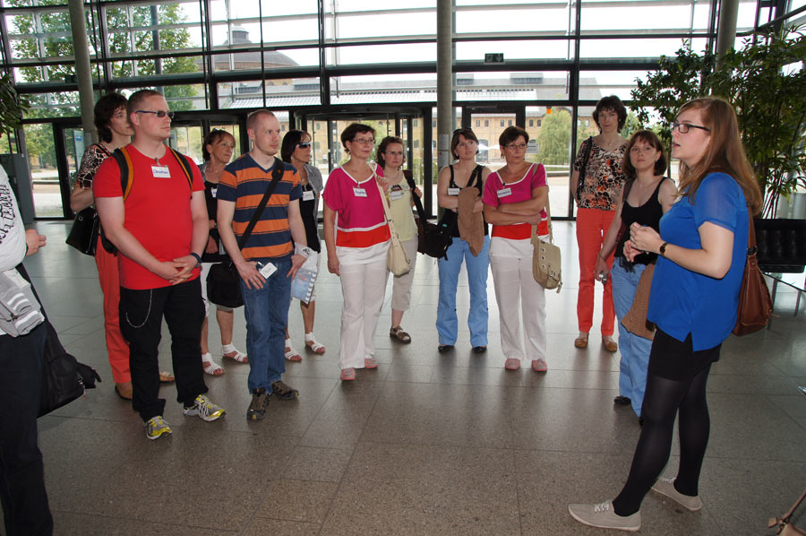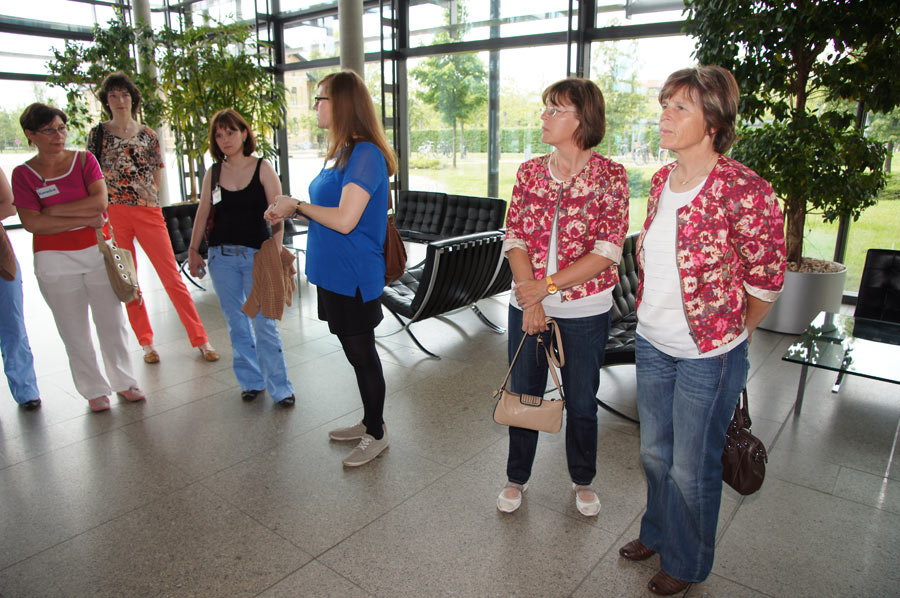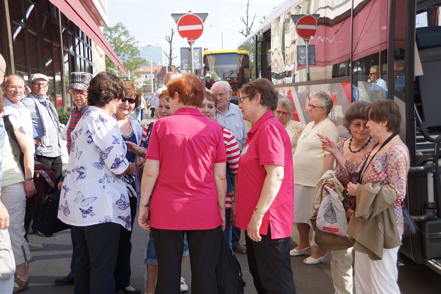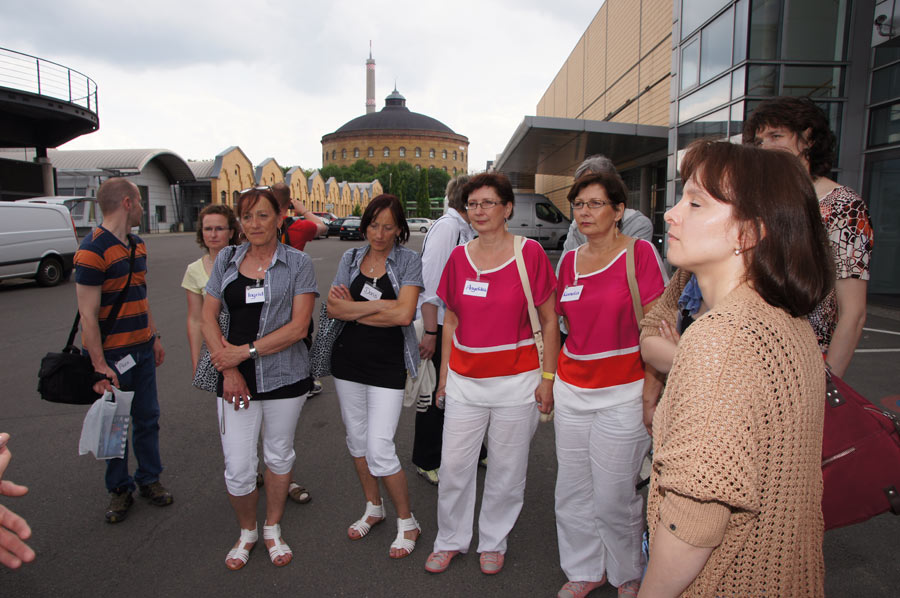 Am nächsten Vormittag standen vor dem Hotel bereits drei (!) Reisebusse bereit, um die Zwillinge nach dem Frühstück zu einer Freitreppe am Völkerschlachtdenkmal zu bringen, einem attraktiven Ort für das Gruppenfoto. Danach ging es direkt weiter zum Gelände des MDR. Die Gruppen teilten sich jetzt auf. Die Insassen von Bus 1 u. 2 brachen zur MDR Studiotour auf und wurden bereits von netten Gästeführerinnen erwartet. Die Zwillinge in Bus 3 konnten dagegen eine freundliche Stadtführerin begrüßen, die während der folgenden Stadtrundfahrt viel über die Stadt und ihre Bewohner zu berichten wusste. Zum Mittagessen in der großen Cafeteria waren alle Zwillinge wieder vereint. Später trennten sich die Gruppen dann wieder und beschritten die Wege der jeweils anderen vom Vormittag.