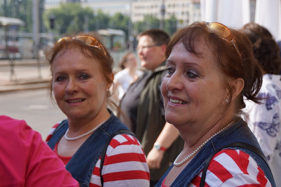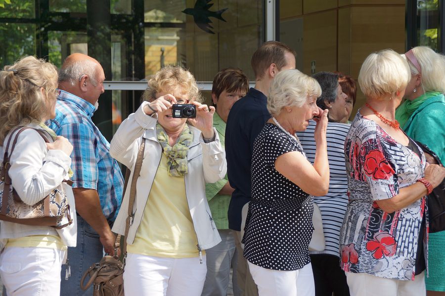 Am nächsten Vormittag standen vor dem Hotel bereits drei (!) Reisebusse bereit, um die Zwillinge nach dem Frühstück zu einer Freitreppe am Völkerschlachtdenkmal zu bringen, einem attraktiven Ort für das Gruppenfoto. Danach ging es direkt weiter zum Gelände des MDR. Die Gruppen teilten sich jetzt auf. Die Insassen von Bus 1 u. 2 brachen zur MDR Studiotour auf und wurden bereits von netten Gästeführerinnen erwartet. Die Zwillinge in Bus 3 konnten dagegen eine freundliche Stadtführerin begrüßen, die während der folgenden Stadtrundfahrt viel über die Stadt und ihre Bewohner zu berichten wusste. Zum Mittagessen in der großen Cafeteria waren alle Zwillinge wieder vereint. Später trennten sich die Gruppen dann wieder und beschritten die Wege der jeweils anderen vom Vormittag.