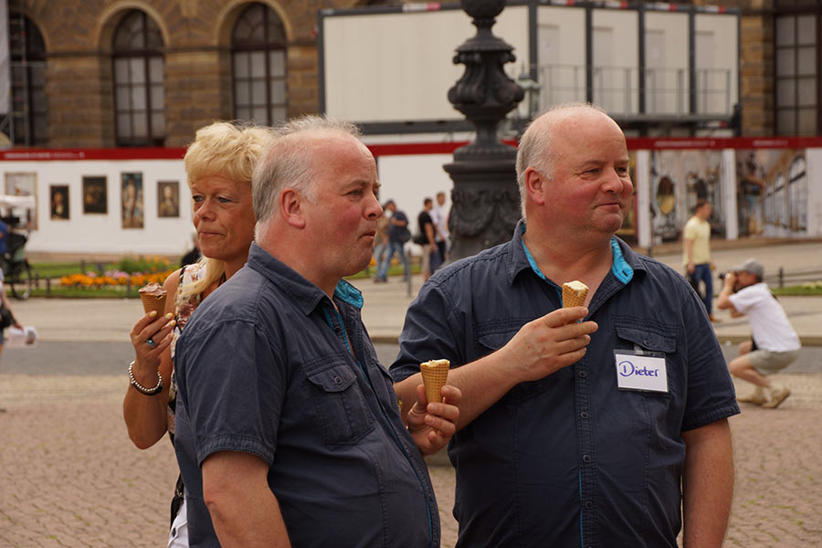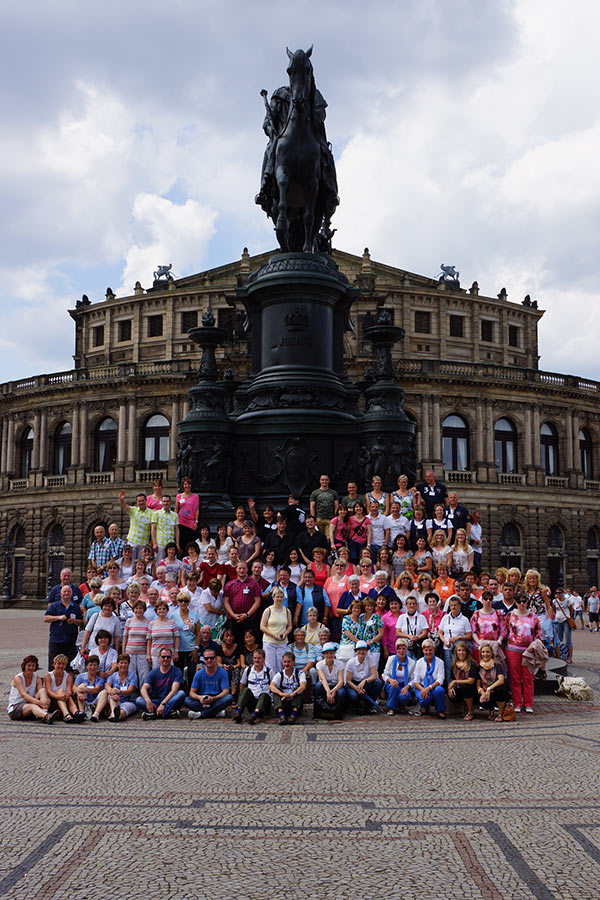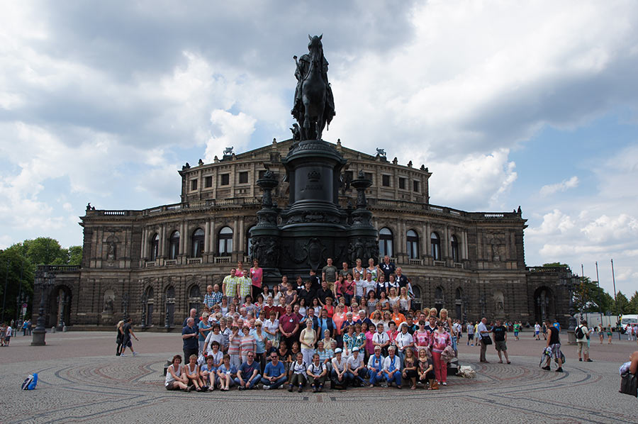 Fast alle Zwillinge übernachteten im nahegelegenen „Motel One“ und am nächsten Morgen wurden wir bereits von 3 Bussen erwartet, die uns nach Meißen in die Porzellanmanufaktur brachten. Über so viel Kunst, Liebe zum Detail und den Spagat zwischen Tradition und Moderne konnten wir nur staunen. Im Restaurant der Porzellanmanufaktur wurden wir auf echtem Meißner Porzellan fürstlich bewirtet und konnten auf der Sonnenterrasse die Eindrücke der Führung durch das Haus Revue passieren lassen. Am Nachmittag fuhren wir nach Dresden und hatten vor der Semperoper die perfekte Kulisse für unser Gruppenfoto!